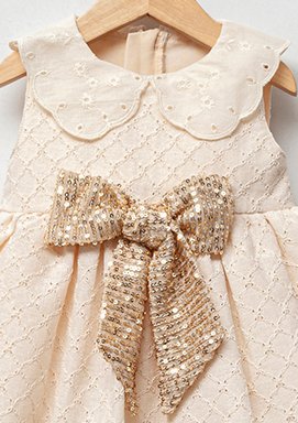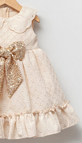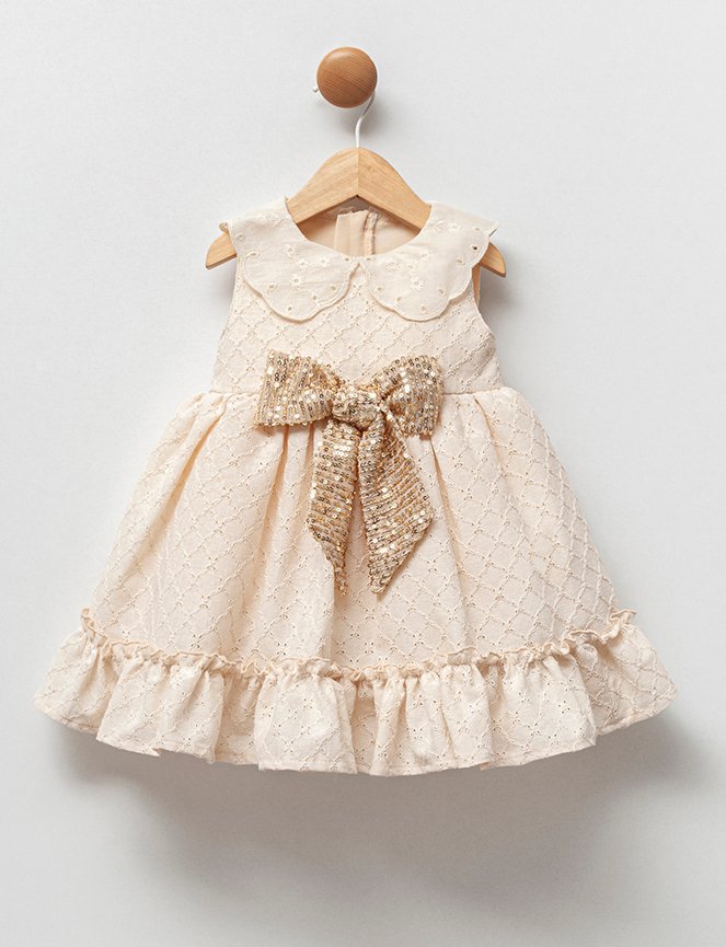 Δαντελένιο φόρεμα με φιόγκο χρυσό (6-18 μηνών) που θα απογειώσει το στυλ του παιδιού σας σε κάθε εμφάνιση του. Φόρεμα δαντελένιο σε κρεμ χρώμα με γιακά, εσωτερική επένδυση και τούλι. Φερμουάρ στο πίσω μέρος.