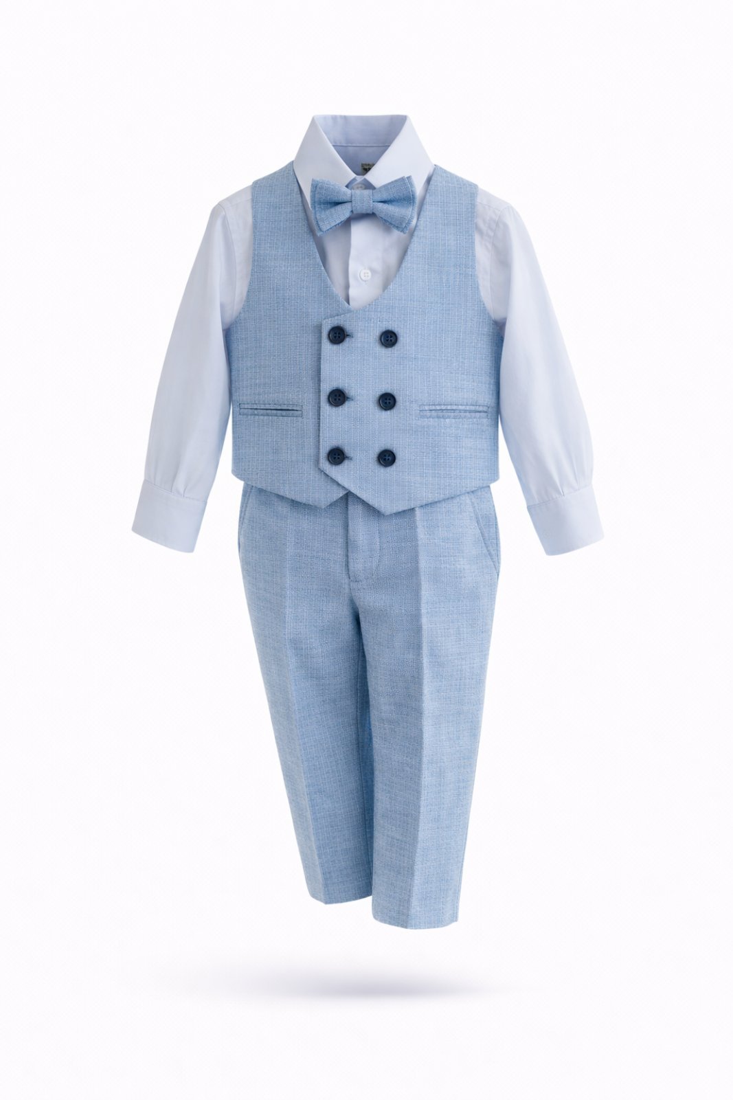 Ιδανικό παιδικό μπλε κοστούμι 4τμχ, που θα απογειώσει το στυλ του παιδιού σας για τις επίσημες εμφανίσεις του. Αποτελείται από το παντελόνι, το γιλέκο το παπιγιόν και το λευκό πουκάμισο.