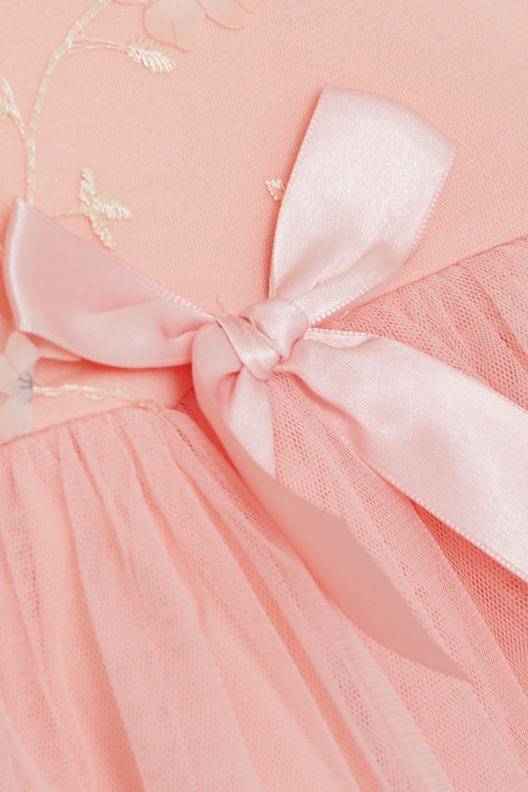 Χαρακτηριστικά προϊόντος : Φόρεμα σε σομόν χρώμα. Το πάνω μέρος με λουλούδια στο τούλι και το κάτω με σομόν τούλι, εσωτερική επένδυση