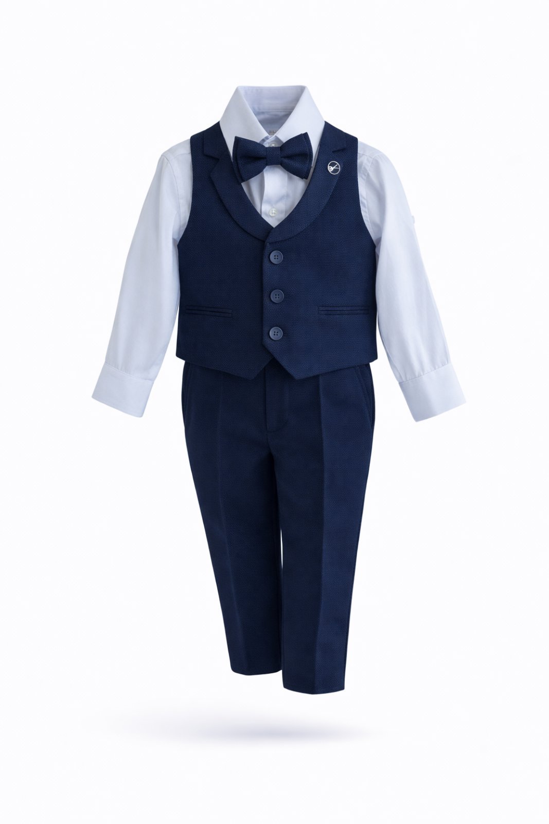 Ιδανικό παιδικό μπλε κοστούμι 4τμχ, που θα απογειώσει το στυλ του παιδιού σας για τις επίσημες εμφανίσεις του. Αποτελείται από το παντελόνι, το γιλέκο το παπιγιόν και το λευκό πουκάμισο.