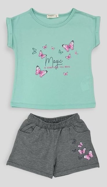 Χαρακτηριστικά προϊόντος : Βεραμάν σετ σορτσάκι πεταλούδες. Σετ από βεραμάν μπλουζάκι & γκρι σορτσάκι με λεπτομέρειες πεταλούδες