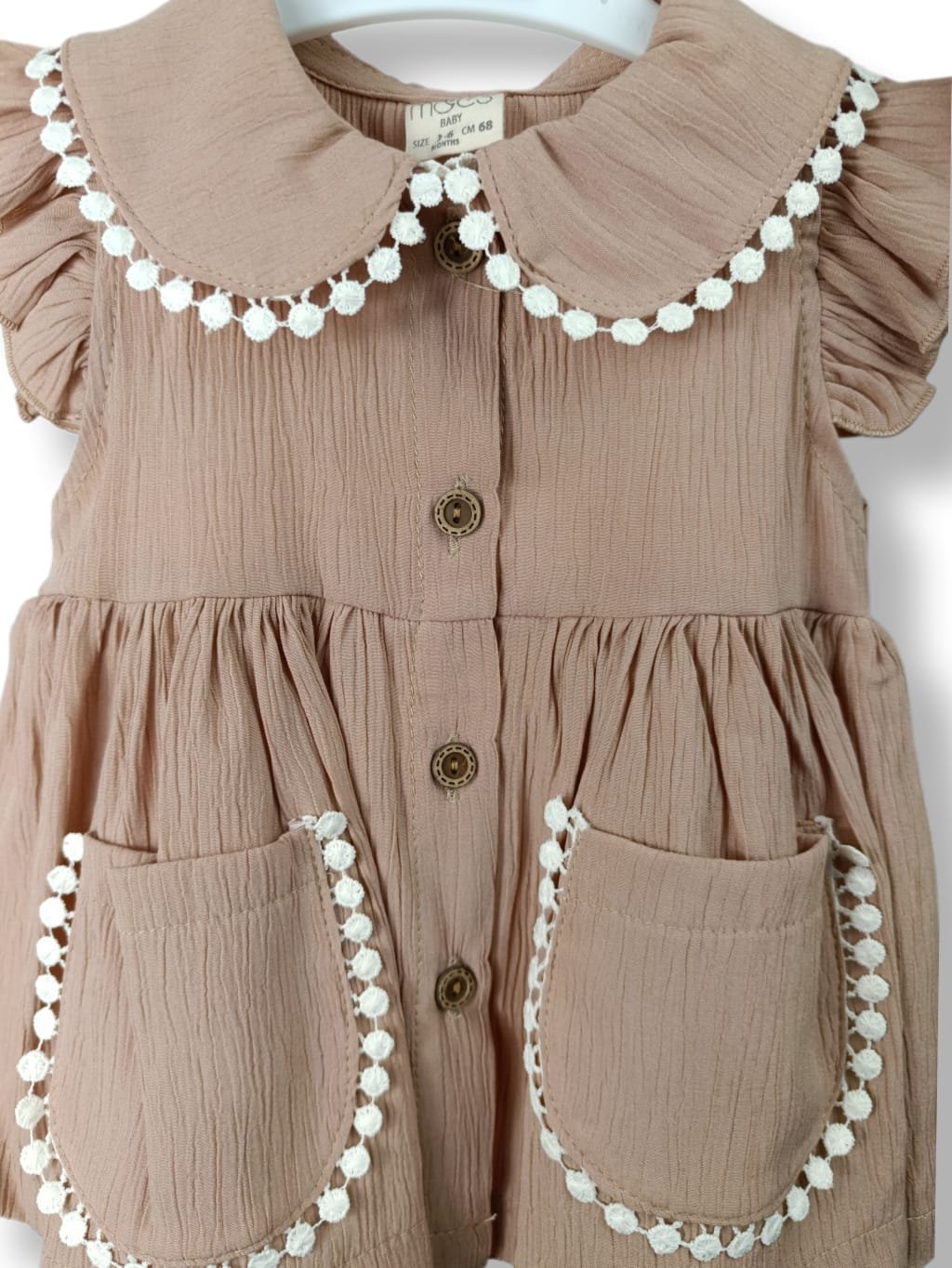 Χαρακτηριστικά προϊόντος : Σκούρο μπεζ σεμιζιέ με φουφούλα & τσέπες (3-18 μηνών) , λευκές λεπτομέρειες και βολάν στα μανίκια. Άνετη εφαρμογή