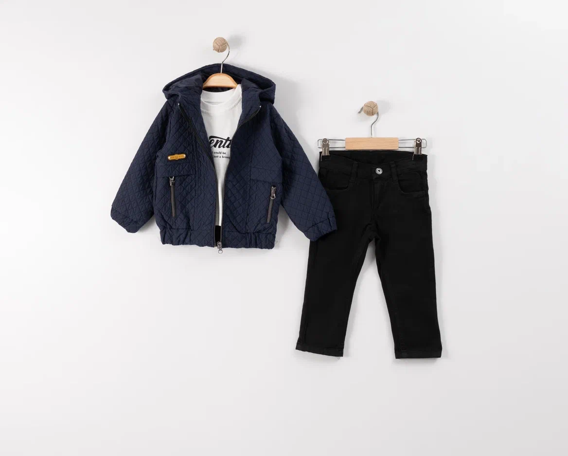 Μπλε τζάκετ εποχής σετ 3τμχ με τζιν παντελόνι που θα απογειώσει το στυλ του παιδιού σας. Το σετ 3τμχ αποτελείται από το μπλε τζάκετ εποχής τύπου καπιτονέ με κουκούλα και λειτουργικές πλαϊνές τσέπες, το τετράτσεπο μαύρο τζιν παντελόνι και το λευκό T-shirt με λογότυπο. Φόρεσε τα και ξεχωριστά συνδυάζοντάς τα με άλλα ρούχα!! Ιδανικό σετ για όλες τις ώρες της ημέρας.