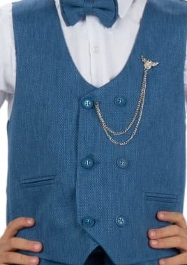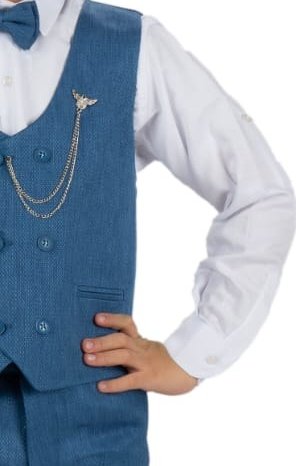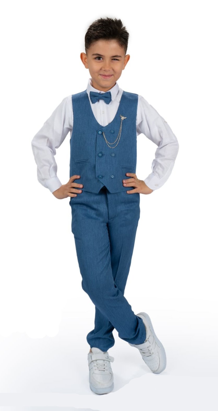 Ιδανικό παιδικό μπλε κοστούμι 4τμχ, που θα απογειώσει το στυλ του παιδιού σας για τις επίσημες εμφανίσεις του. Αποτελείται από το παντελόνι, το γιλέκο το παπιγιόν και το λευκό πουκάμισο.
