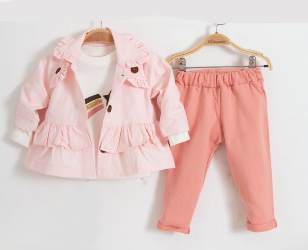Ιδανικό σετ που θα απογειώσει το στυλ του παιδιού σας για casual και μη εμφανίσεις. Το σετ αποτελείται από την ροζ ζακέτα με λεπτομέρειες βολάν, την λευκή μπλούζα με μοτίβο αστέρι και το σκούρο ροζ παντελόνι τύπου φόρμας. Επιπλέον, φόρεσε τα και ξεχωριστά συνδυάζοντάς τα με άλλα ρούχα!!