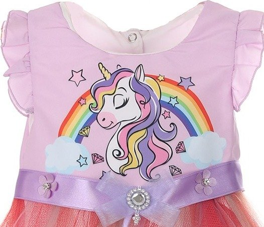 Πολύχρωμο φόρεμα με μονόκερο & τούλι (1-4 ετών) που θα απογειώσει το στυλ του παιδιού σας. Φόρεμα μωβ το πάνω μέρος με φιγούρα, στρογγυλή λαιμόκοψη, βολάν στο μανίκι, σατέν μωβ ζωνάκι & κουμπάκια στο πίσω μέρος, πολύχρωμο τούλι & εσωτερική επένδυση . Από 100% βαμβάκι. Ιδανικό φόρεμα για ξεχωριστές εμφανίσεις