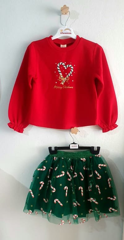 Ένα όμορφο Χριστουγεννιάτικο σετάκι δύο τεμαχίων για τις γιορτινές εμφανίσεις. Μπλουζάκι με στάμπα στο εμπρός μέρος. Λάστιχο στο λαιμό και στα μανίκια. Φούστα από τούλι με λάστιχο στη μέση.Σύνθεση 98% βαμβάκι και 2% ελαστάνη.