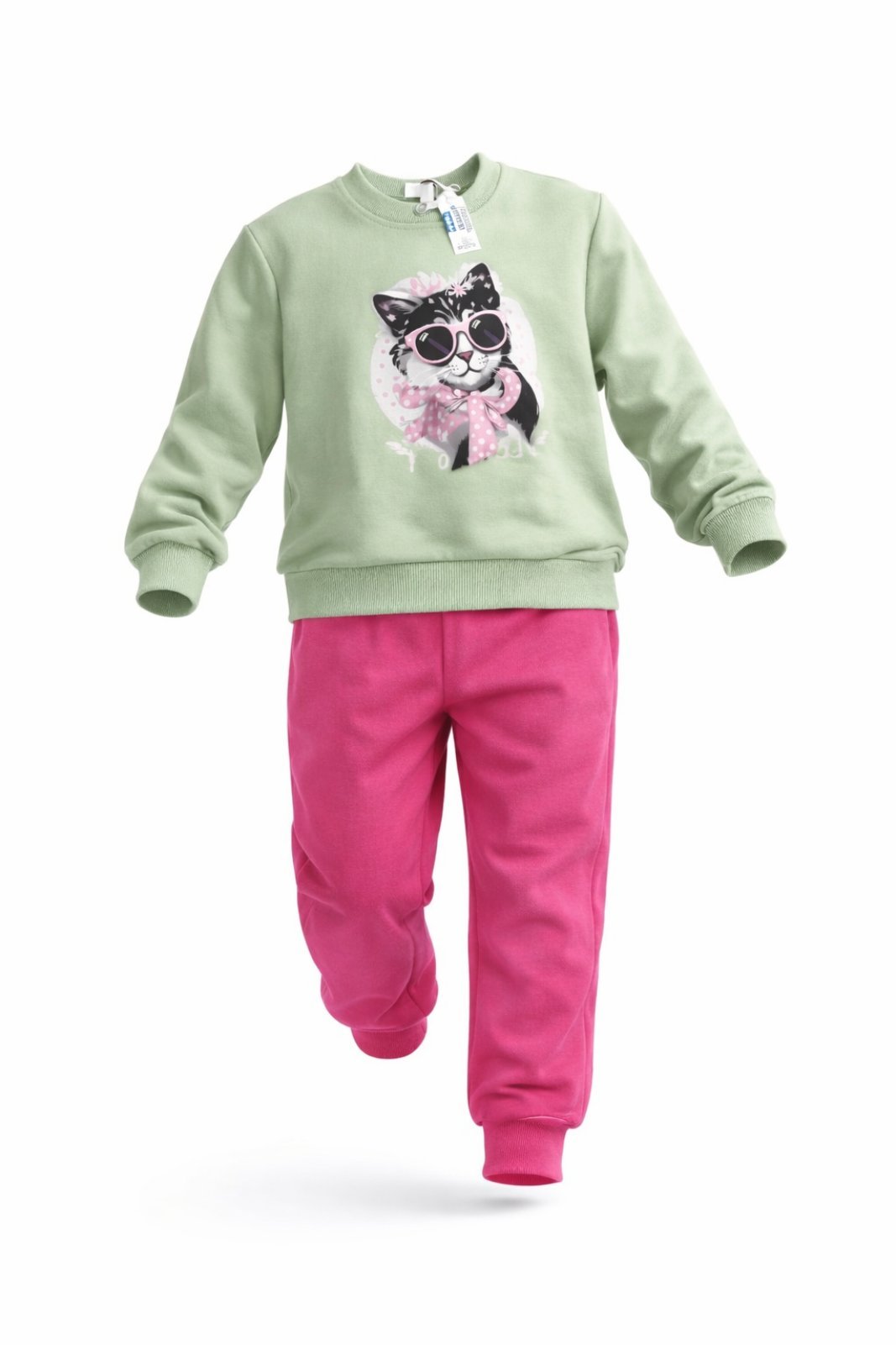 Ένα μοδάτο πρακτικό σετάκι για όλες τις ώρες, από φούτερ ύφασμα. Τύπωμα στο εμπρός μέρος και φιογκάκι στο πίσω μέρος. Λάστιχο στο λαιμό και στα μανίκια. Παντελόνι φούτερ με λάστιχο περιμετρικά στη μέση και στο κάτω μέρος. Σύνθεση: 95% βαμβάκι και 5% ελαστάνη.