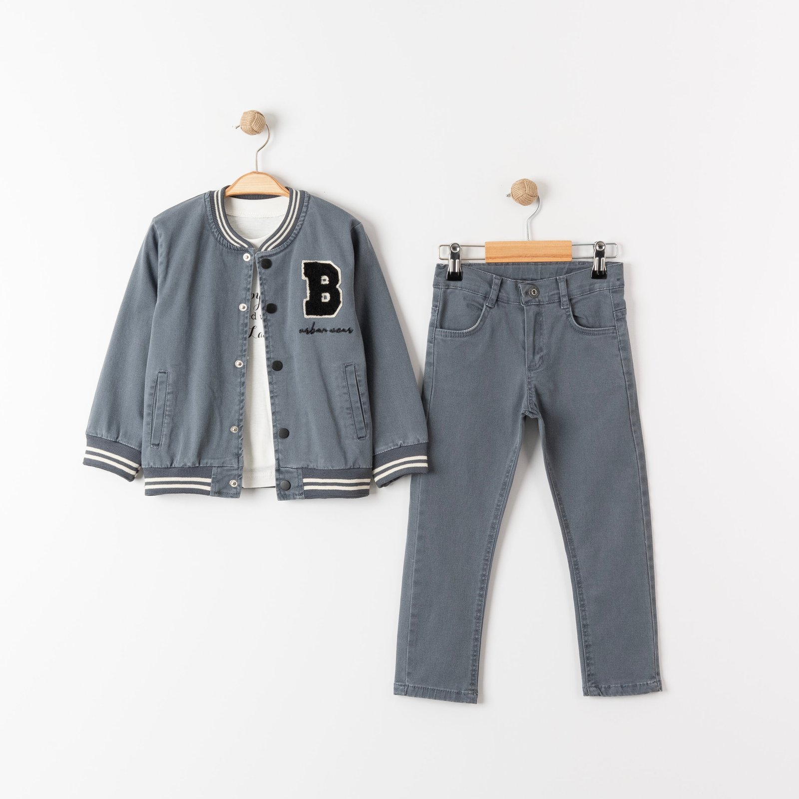 Τζιν τζάκετ & παντελόνι σετ 3τμχ “B” που θα απογειώσει το στυλ του παιδιού σας. Το σετ τζιν τζάκετ & παντελόνι αποτελείται από το λευκό T-shirt με λογότυπο, μπλε τζάκετ με στρογγυλό γιακά τύπου κολεγιακό , με λειτουργικές τσέπες, μαύρα κουμπιά και λογότυπο “B” & παντελόνι τετράτσεπο σε μπλε απόχρωση . Φόρεσε τα και ξεχωριστά συνδυάζοντάς τα με άλλα ρούχα!! Ιδανικό σετ για όλες τις ώρες της ημέρας.