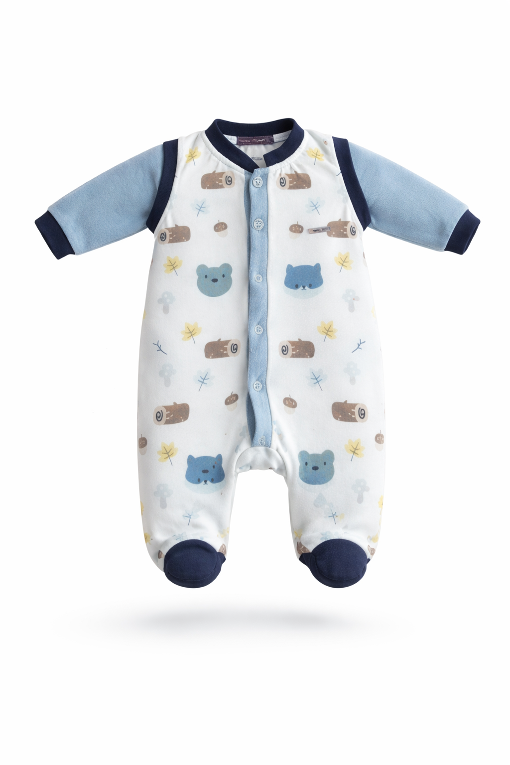 To πιο ζεστό φορμάκι από βελουτέ βαμβακερό ύφασμα. σχέδια στο εμπρός μέρος με αρκουδάκια. Άνοιγμα με κουμπιά και τρουκς στο μπροστινό μέρος για εύκολη αλλαγή πάνας. Σύνθεση από 80% βαμβάκι και 20% πολυεστέρας.