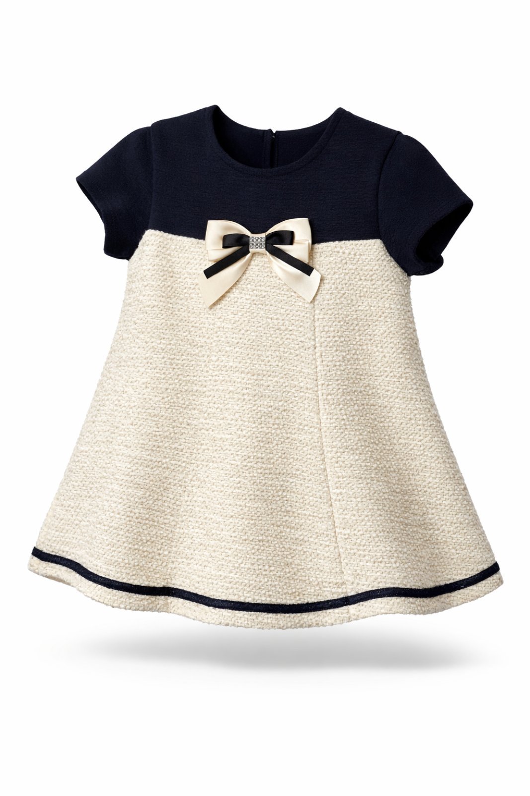Φόρεμα για τις επίσημες εμφανίσεις των κοριτσιών μας. Κοντομάνικο φόρεμα με φιόγκο με στρας στο μπροστινό μέρος. Μεσάτο με άλφα γραμμή στο τελείωμα.