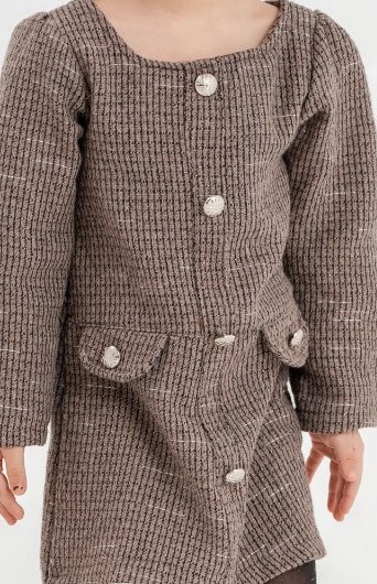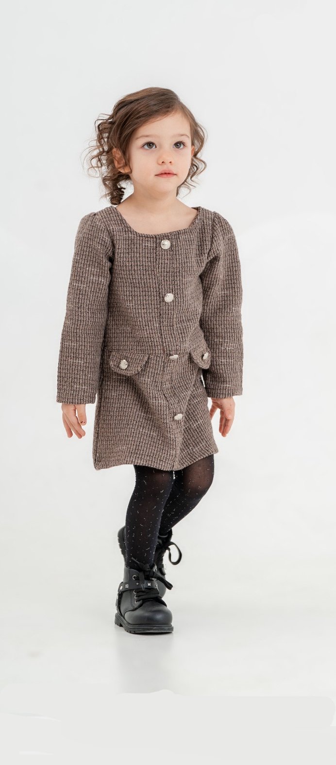 Φόρεμα καφέ με ασημοκλωστή με λεπτομέρειες ασημί κουμπιά, φερμουάρ στο πίσω μέρος, φόρεμα σε άλφα γραμμή που θα απογειώσει το στυλ του παιδιού σας. Ιδανικό για την άνοιξη ,φθινόπωρο, χειμώνα