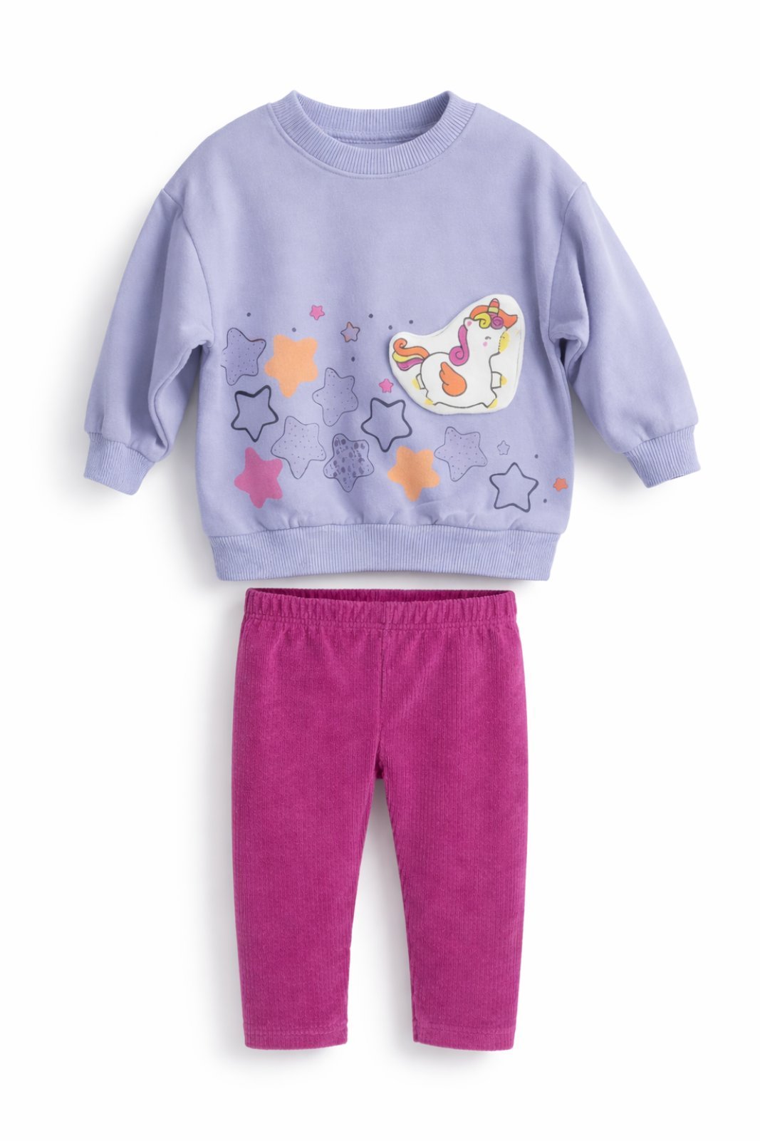Μια πρακτική φορμούλα για κάθε μέρα από βαμβακερό ύφασμα. Μπλούζα με ραμμένο unicorn και διακοσμητικά αστεράκια στο εμπρός μέρος. Λάστιχο στο λαιμό, στα μανίκια και περιμετρικά στο κάτω μέρος. Παντελόνι κοτλέ με λάστιχο περιμετρικά στη μέση. Σύνθεση από 100% βαμβάκι.