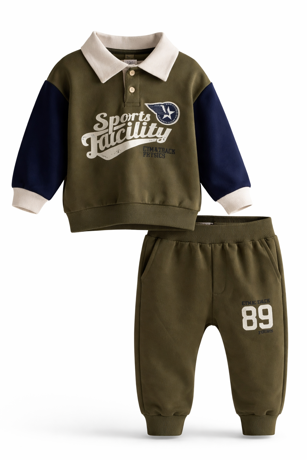 Ένα σετάκι για τα αγόρια μας για τις πιο μοδάτες εμφανίσεις, από λεπτό βαμβακερό ύφασμα. Μπλούζα με τύπωμα στο εμπρός μέρος και . Γιακαδάκι στο λαιμό και λάστιχο στα μανίκια. Παντελόνι με λάστιχο περιμετρικά στη μέση και στο κάτω μέρος. Σύνθεση από 98% βαμβάκι και 2% ελαστάνη.